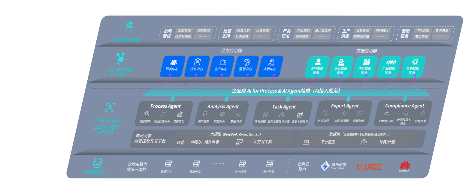 端到端的一站式AI工作空间深度融合了从企业战略规划到日常经营的全流程业务板块,,定向解决车企内部领域多、、部门多、、链条长、、场景碎片化等难题,,,,支持车企快速构建以AI为核心的生产力写作体系,,实现任务执行与AI能力的无缝集成与交互