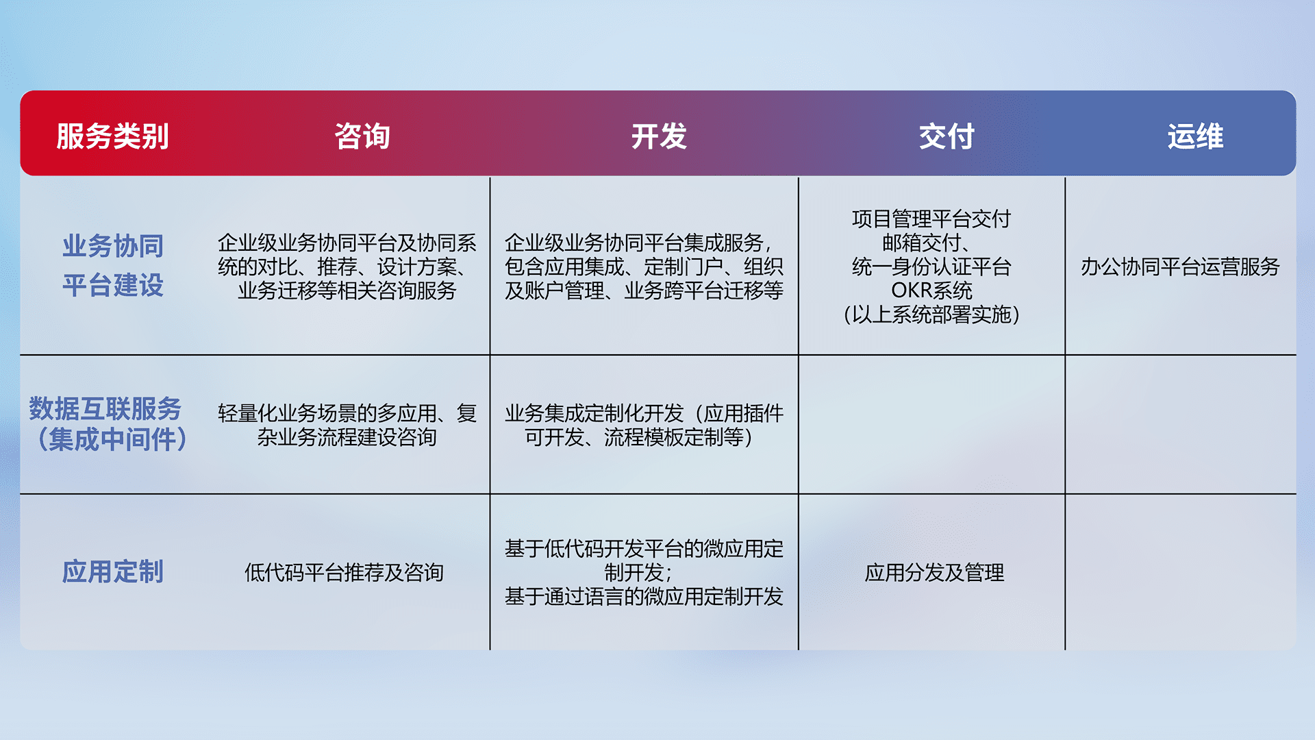 针对钉钉、、、企微、、IDaas等平台级产品提供产品的规划、、方案、、、交付、、、、定制化开发等服务,,,实现如统一协同办公、、、、智能客户服务、、、混合会议管理、、、、智能数据查询、、等业务场景,,实现数字化转型。。