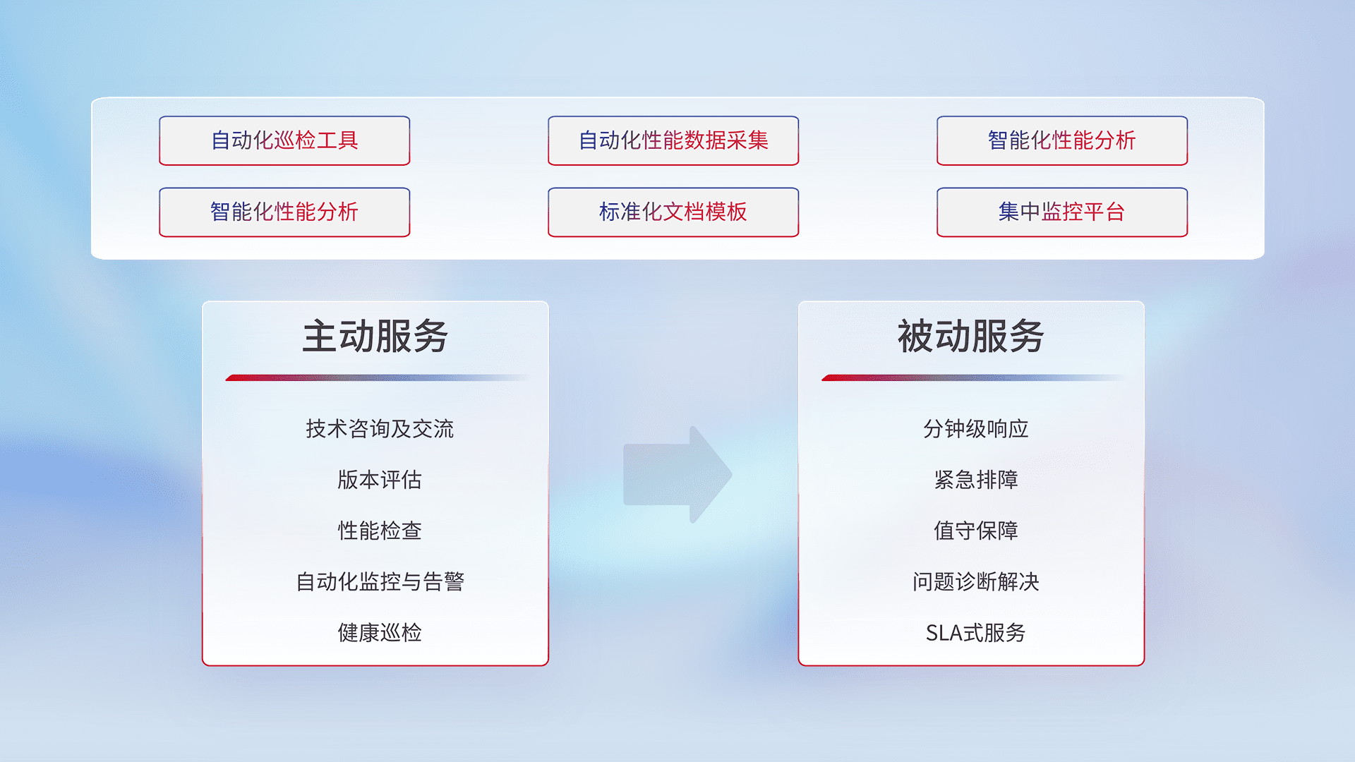 智能化工具和标准化文档,,,保障服务质量,,提供主动服务(包含技术咨询、、版本评估、、、性能检查、、、自动化监控与告警、、、、健康巡检)和被动服务包含(分钟级响应、、、、紧急排障、、值守保障、、问题诊断解决、、SLA服务)。。。。